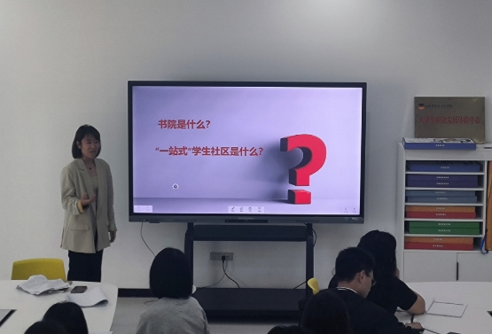 接着,窦倩结合本书院学生社区,依次介绍了成长发展区、文化休闲区、艺术实践区、社团活动区4个功能区域,以及党建服务中心、心理健康中心、生涯发展中心等7个社区中心进行详细介绍。她表示,中心将立足学生成长,以学生需求为导向,依托大咖导师团、学业导师、任课教师及朋辈赋能志愿服务团,为学生的学习与发展提供专业化的指导、咨询和支持服务,全方位满足学生不同层次、不同类别的需求,引导学生勤学笃实、追求卓越。